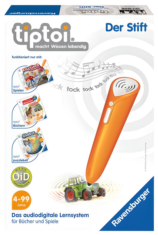 Dieser Stift ist mit neuartiger OID-Technologie ausgestattet: Ein optischer Sensor liest versteckte Codes und wandelt diese in Geräusche um. Geräusche, Töne und Stimmen, Geschichten und Spiele werden akustisch lebendig.