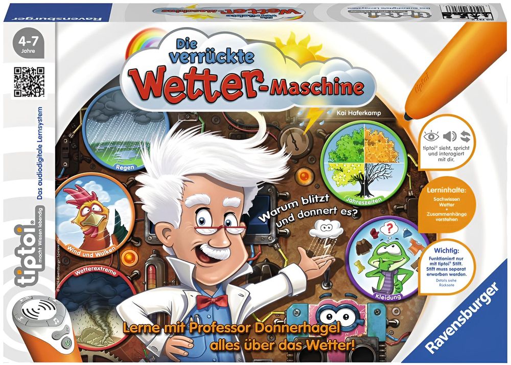 Potz Blitz! Professor Donnerhagel ist ein großartiger Erfinder, doch leider ist bei seinem neuesten Projekt, einer Wettermaschine, etwas schiefgegangen. Die Maschine funktioniert nicht. Er braucht die Hilfe der Kinder, um diese zu starten. Die Kinder schlüpfen mit dem tiptoi Stift in die Rollen der schlauen Assistenten und helfen dem Professor, die Maschine zum Laufen zu bringen, indem sie diese mit Wissen füttern. Hierfür lösen die Spieler Aufgaben und beantworten Fragen aus acht verschiedenen Themenbereichen rund ums Wetter. So werden mit dem tiptoi Lernspiel Die verrückte Wettermaschine den Kindern spielerisch die Jahreszeiten, Niederschläge, Wind, sowie Klima- und Wetterphänomene erklärt. Auch lernen die Kinder, welche Kleidung die passende für die jeweilige Witterung ist. Zu Beginn jeder Spielrunde wird von tiptoi je nach Schwierigkeitsgrad zufällig ein Themenbereich der Maschine ausgewählt. Die Spieler finden Wissenswertes zum Beispiel zu Niederschlägen, Windstärken, Wolkenarten und Klimazonen heraus und überlegen sich, was man zu welcher Jahreszeit machen kann. An der Drehscheibe wird die Antwort eingestellt, und durch Tippen mit dem tiptoi Stift auf das Feld erfahren die Spieler, ob ihre Antwort richtig ist. Falls eine Frage nicht gleich beantwortet werden kann, geben Flippi der Frosch, Gustav der Gockel oder Sunny die Schwalbe hilfreiche Tipps.Nach jeder richtig beantworteten Frage wird das Wissen auf einem CD-Spielchip gespeichert und dieser in die Fernbedienung geschoben. So lernt die Wettermaschine dazu und die Farbe der Lampe verändert sich mit jeder neuen CD, bis sie nach elf eingeschobenen Chips grün leuchtet. Die Wettermaschine ist betriebsbereit. Jetzt auf den grünen Startknopf der Fernbedienung drücken - und schon können Blitz, Donner und Sonnenschein entstehen. Als Belohnung singen zum Schluss noch alle ein lustiges Wetterlied mit Flippi dem Frosch.Funktioniert nur mit tiptoi Stift, der separat erworben werden muss.