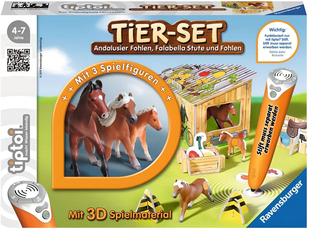 Inhalt: tiptoi Spielfiguren Falabella Stute, Falabella Fohlen und Andalusier Fohlen, Weide-Stall, Box mit Putzzeug, zwei Stroh-Plättchen, Sattel-Ständer, zwei Pylonen, sechs Futter-Chips
