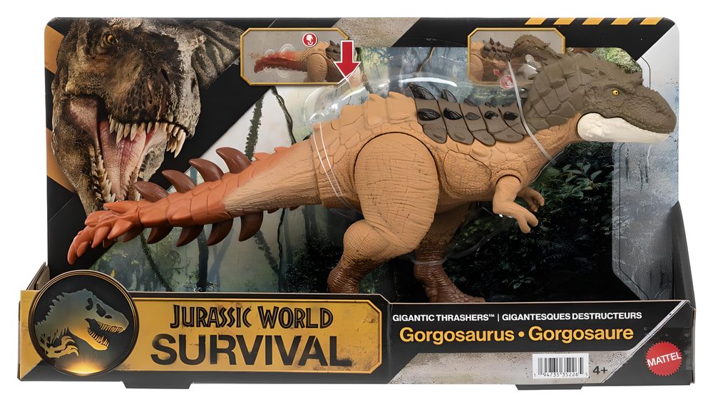 Die Jurassic World: Survival Actionfigur Gigantic Thrashers Gorgosaurus bringt dynamische Dino-Action direkt ins Kinderzimmer. Die imposante Figur ist detailreich gestaltet und orientiert sich optisch an den bekannten Urzeit-Riesen aus dem Jurassic-Universum. Markante Schuppenstruktur, kräftige Gliedmaßen und ein beweglicher Kiefer sorgen für ein eindrucksvolles Erscheinungsbild.