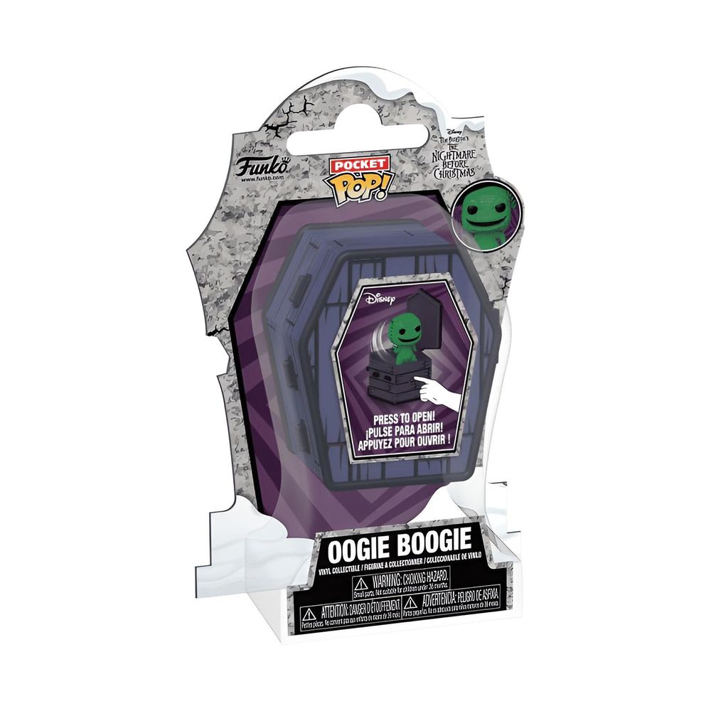 Diese exklusive "Nightmare Before Christmas Coffin Pocket POP! Vinyl Figur Oogie Boogie" ist ein Muss für alle Fans von Tim Burtons ikonischem Film. Diese Sammlerfigur misst etwa 6 cm und zeigt den unvergesslichen Bösewicht Oogie Boogie in seiner charakteristischen grünen Sackleinen-Optik.