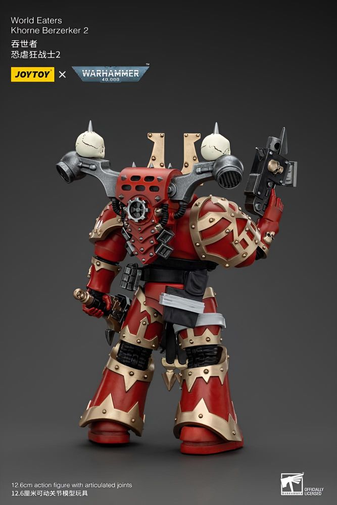 Die Warhammer 40k Actionfigur 1/18 World Eaters Khorne Berzerker 2 mit einer Höhe von etwa 13 cm bringt die brutale Ästhetik der legendären Krieger des Chaos detailreich ins Regal. Die Figur orientiert sich optisch an der düsteren Zukunftswelt des Tabletop-Universums und setzt auf markante Rüstungselemente, dynamische Proportionen und eine eindrucksvolle Silhouette.