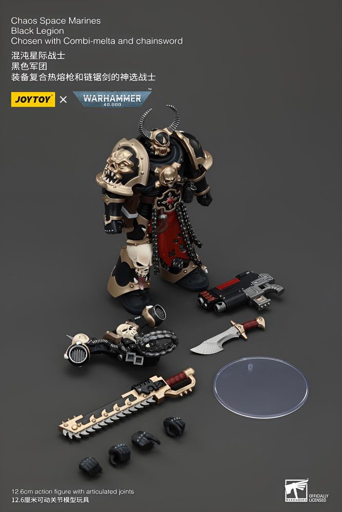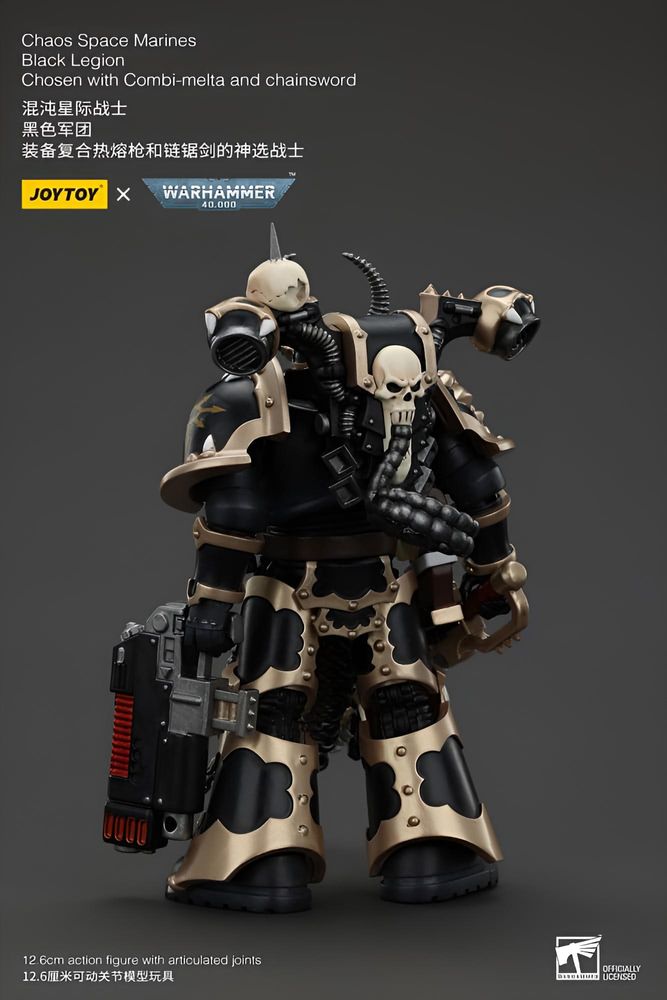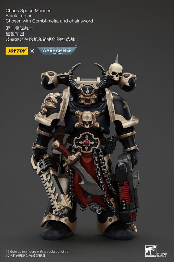 Die Warhammer 40k Actionfigur Chaos Space Marines Black Legion Chosen with Combi-melta and chainsword bringt die finstere Atmosphäre des 41. Jahrtausends detailreich ins Regal. Mit einer Höhe von etwa 20 cm überzeugt die Figur durch aufwendige Rüstungsdetails, markante Symbole der Black Legion und eine bedrohliche Pose, die den Charakter eines auserwählten Kriegers perfekt einfängt.