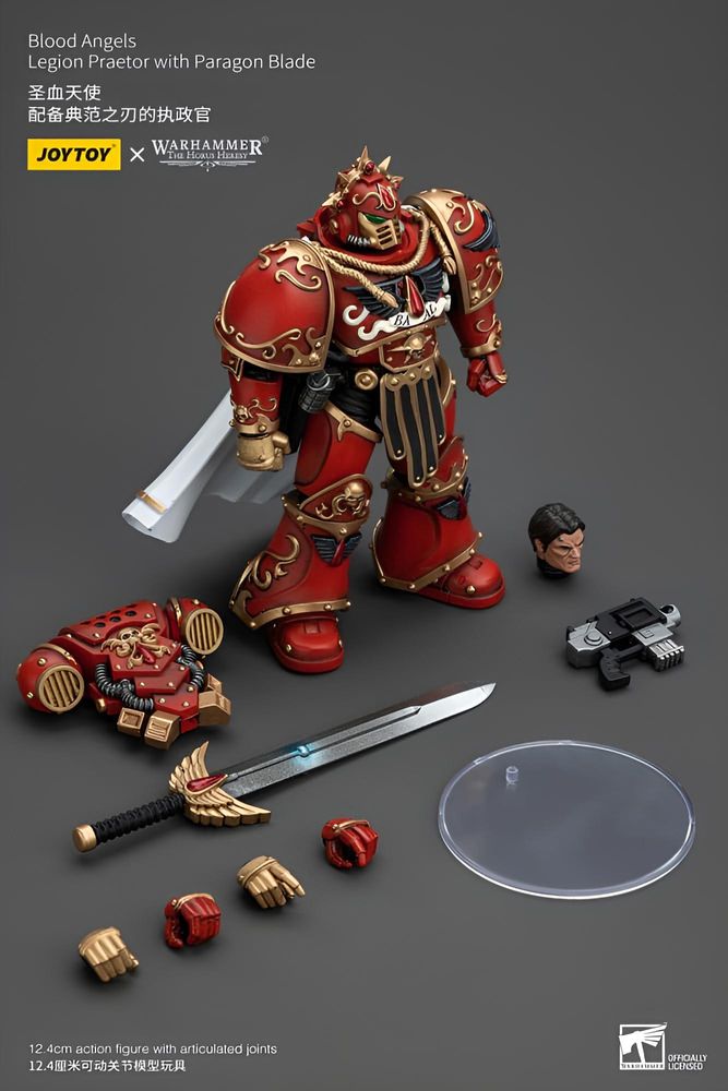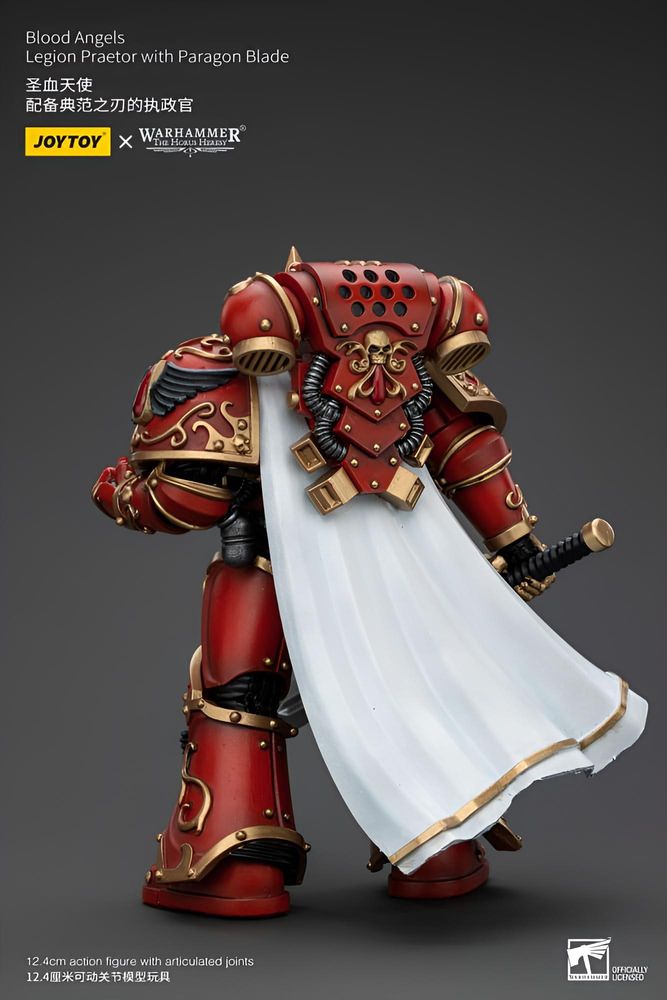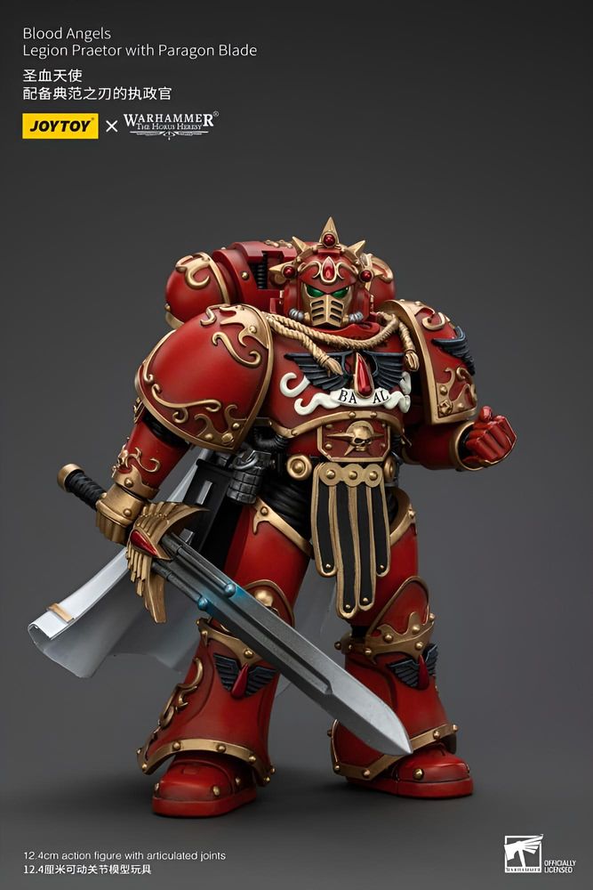 Der Praetor trägt eine kunstvoll gestaltete Servorüstung in typischen Blood-Angels-Farben und führt ein markantes Paragon Blade, das seine Rolle als Nahkampf-Spezialist unterstreicht. Bewegliche Gelenke ermöglichen dynamische Posen, sodass ikonische Szenen aus dem Horus-Heresy-Universum nachgestellt werden können.