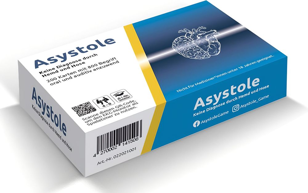 Asystole Kartenspiel für Mediziner:innen ist ein pointiertes Gesellschaftsspiel, das speziell für Ärztinnen, Ärzte und Medizinstudierende entwickelt wurde. Mit medizinischen Begriffen, typischen Alltagssituationen aus Klinik und Praxis sowie fachnahen Fragestellungen verbindet es spielerische Unterhaltung mit fachlichem Know-how.