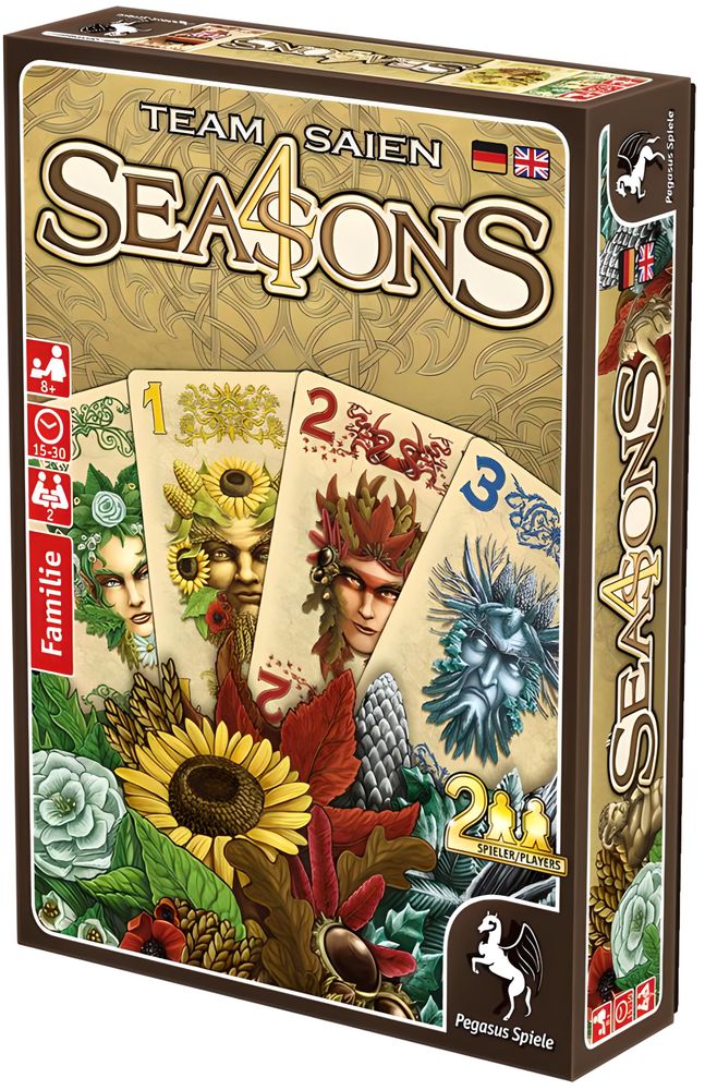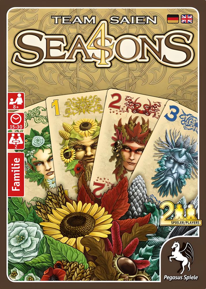 4 Seasons ist ein elegant gestaltetes Kartenspiel für Zwei, das schwierige Entscheidungen und ein spannendes Duell mit ganz einfachen, intuitiven Regeln kreiert. Durch eine kreative Art des Kartenmischens haben beide Spieler die exakt selben Voraussetzungen. Dennoch gibt es genug geheime Informationen, um es zu ermöglichen, den Gegner zu bluffen und ihn wiederholt in schwierige Lagen zu versetzen.