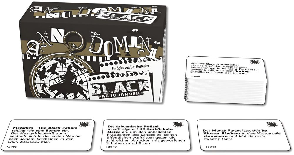 Bei Anno Domini müssen Ereignisse in die richtige zeitliche Abfolge gebracht werden. Es kommt dabei jedoch nicht auf exaktes Wissen an. Wer gut bluffen kann hat beste Chancen seine Karten als Erster loszuwerden und damit zu gewinnen. Doch Achtung, die Ausgabe BLACK ist voller düsterer Ereignisse mit Katastrophen, Seuchen, grausamen Todesfällen sowie menschlicher Niedertracht und daher für Kinder und Jugendliche unter 18 Jahren nicht geeignet.