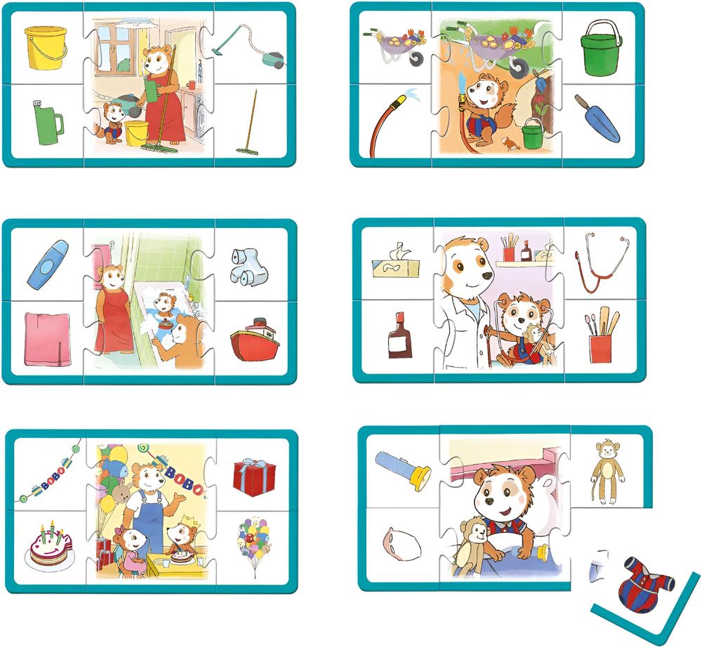 Der kleine Bobo Siebenschläfer erlebt jeden Tag etwas Neues. Auf sechs Themenkarten könnt ihr sehen, wie Bobo mit Papa badet, was Bobo beim Arzt erlebt, wie er Geburtstag feiert, im Garten und beim Saubermachen hilft und natürlich wie Bobo schlafen geht. Zu jeder Themenkarte gehören vier kleinere Bildkarten. Auf ihnen sind Dinge abgebildet, die zu den Erlebnissen auf den Themenkarten gehören. Zum Baden benötigt Bobo Shampoo, ein Boot, einen Wasserhahn und zum Schluss ein Handtuch. Und zu einer ordentlichen Geburtstagsfeier gehören Kuchen, Luftballons, Girlanden und Geschenke. Findet ihr zu allen Erlebnissen die passenden Gegenstände?