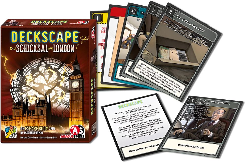 Deckscape - Das Schicksal von London ist ein Escape Room Spiel im Taschenformat. Es kann mit einer Gruppe von Freunden oder auch alleine gespielt werden. Ein Agent des Geheimdienstes hat euch unter den besten Spezialeinheiten von Scotland Yard für eine streng geheime Mission ausgewählt. London ist in Gefahr und ihr seid die Einzigen, die die Stadt jetzt noch retten können. Findet die vier versteckten Bomben und entschärft sie bevor es zu spät ist. Werdet ihr es schaffen, die einzigartigen Rätsel in diesem Abenteuer zu lösen, um London rechtzeitig zu retten?