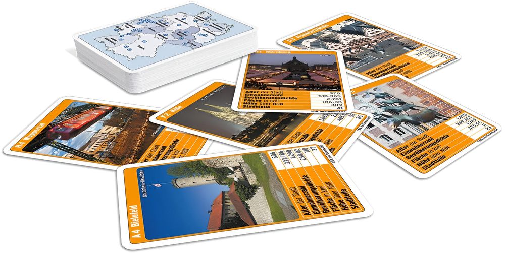 Als Mitbringsel aus dem Urlaub oder kleines Geschenk zwischendurch - im aktuellen Deutschland-Quartett des Teepe Sportverlags werden 32 deutsche Städte in den Kategorien Alter, Einwohnerzahl, Bevölkerungsdichte, Fläche, Höhe und Anzahl Stadtteile miteinander verglichen. Quartett & Trumpf können damit gespielt werden... wer hat die Nase vorn?