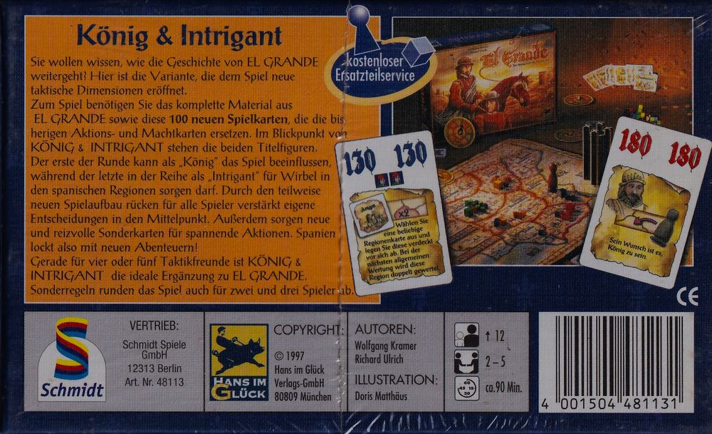 Die Grafikerin Doris Matthäus hat das Spielmaterial wie gewohnt stimmungsvoll in Szene gesetzt. Im Blickpunkt von KÖNIG & INTRIGANT stehen die beiden Titelfiguren. Der erste der Runde kann als "König Einfluß auf das Spiel nehmen, während der letzte in der Reihe als "Intrigant für Wirbel in den spanischen Regionen sorgen darf. Durch den teilweise neuen Spielaufbau rücken die Entscheidungen der einzelnen Spieler verstärkt in den Mittelpunkt. So kommt der Spielreihenfolge – und damit der Funktion der einzelnen Karten – eine noch größere Bedeutung zu. Außerdem sorgen neue und reizvolle Sonderkarten für viele spannende Aktionen. Gerade für vier oder fünf Taktikfreunde ist KÖNIG & INTRIGANT die ideale Erweiterung zu EL GRANDE. Sonderregeln runden das Spiel auch für zwei und drei Spieler ab.