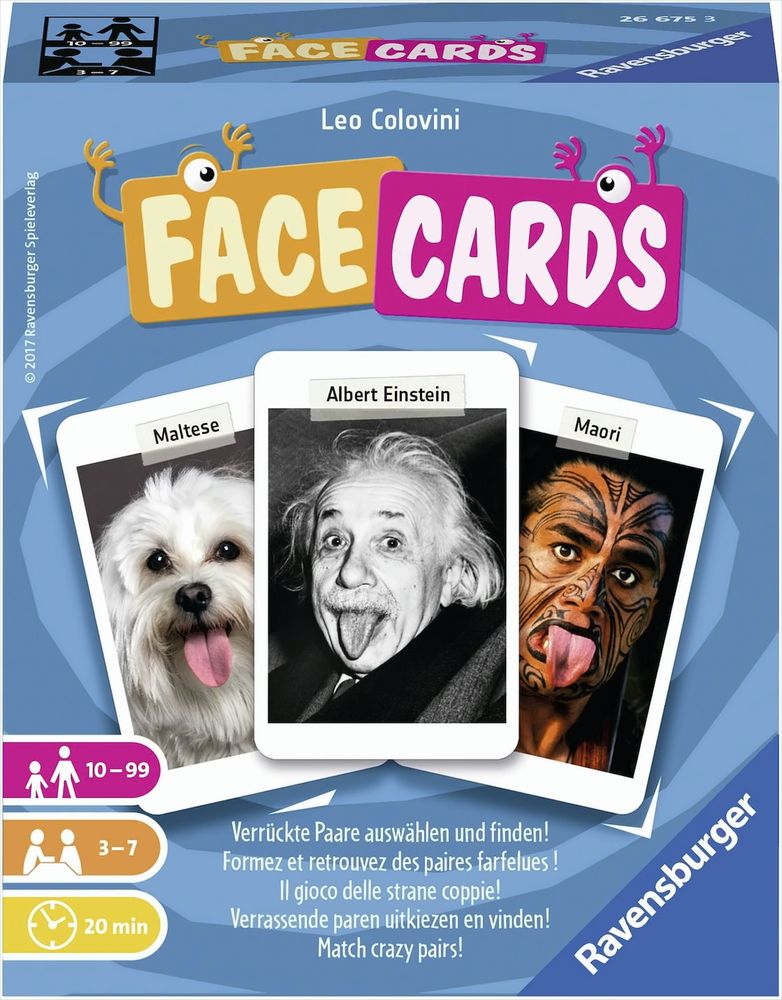 Das Kartenspiel Facecards von Ravensburger enthält mehr als 140 Bilder von Menschen, Tieren und Gegenständen aus unterschiedlichsten Ländern und Jahrhunderten. Während des Spiels bilden die Spieler lustige Kartenpaare aus VIPs, Viechern und vielem mehr und tippen anschließend, was wohl zusammengehören könnte. Dabei sorgen die kurzen Regeln für einen schnellen Einstieg ins Spielvergnügen: einfach auspacken und loslegen! Bis zu 7 Spieler können gleichzeitig mitspielen, mitraten und mitdiskutieren: Facecards sorgt neben jeder Menge Lachern auch für jede Menge Gesprächsstoff. Denn welche Pärchen offensichtlich zusammenpassen, liegt immer im Auge des Betrachters...