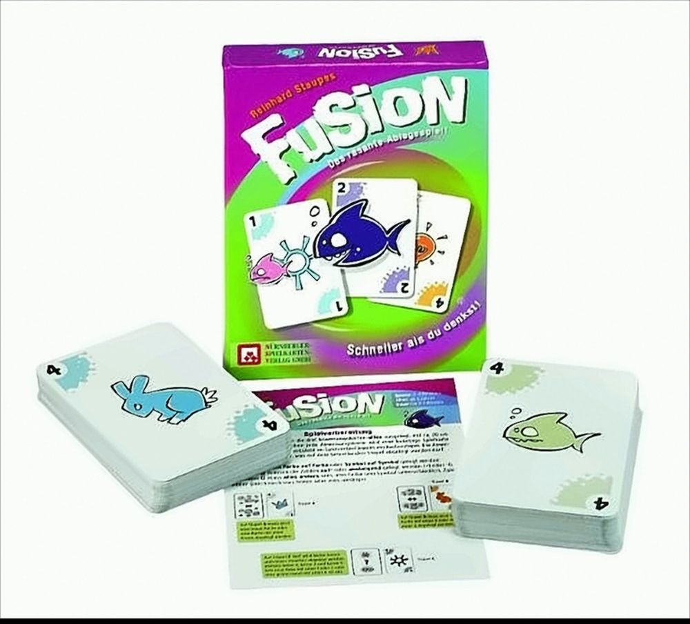Fusion ist der neue Geschwindigkeits-Hit von Reinhard Staupe, dem Erfinder des schnellesten Kartenspiels der Welt. Alle Spieler legen gleichzeitig Ihre Karten auf drei verschiedene Stapel ab und jeder Stapel verlangt etwas anderes! Die Regeln sind minimal. Adrenalin und Spielspaß pur sind garantiert. Einmal gespielt und Du bist voll infiziert. Nix für Langweiler und Trödler!!