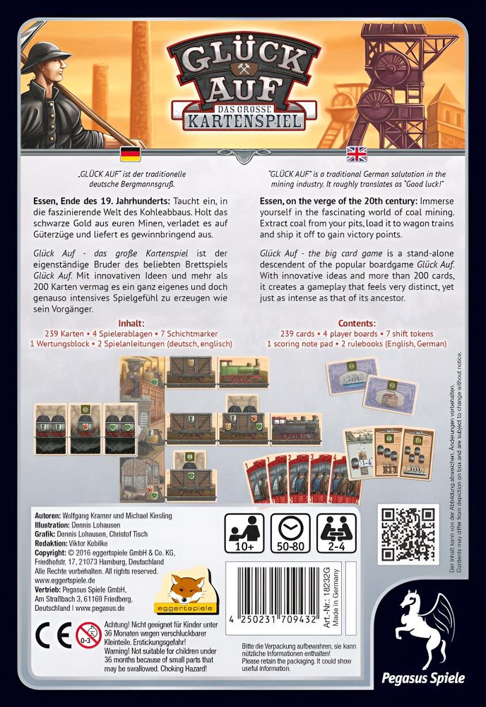 In Glück Auf – Das große Kartenspiel tauchen die Spieler in die Welt des Bergbaus und Kohleschürfens ein. Wie im beliebten Brettspiel Glück Auf, gilt es Kohle zu fördern und diese auf Waggons zu verladen. Doch erst mit der richtigen Lok und einem passenden Auftrag kann die Kohle auf Reisen gehen und den Spielern Siegpunkte bringen. Dabei ist Durchblick gefragt, um die begrenzte Verladefläche optimal zu nutzen und nicht zu viele Zwischenschritte einzulegen. Wer am Ende die hochwertigsten Aufträge ausgeliefert hat und sich zudem passende Aktien und Geschäftsziele sichern konnte, wird als Sieger aus dem Spiel hervorgehen.