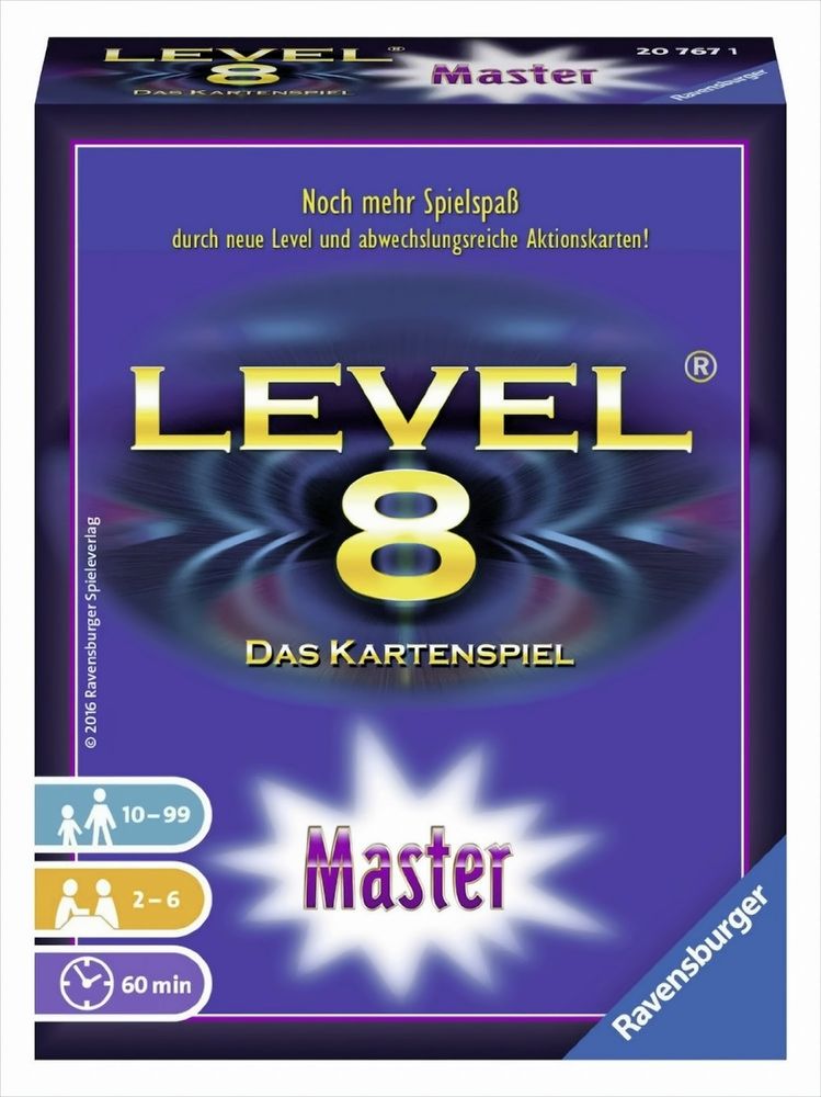 Wer wird Level 8 Master? Mit neuen, anspruchsvolleren Leveln und zahlreichen Aktionskarten, die das schnelle Kartenspiel für 2 bis 6 Spieler ab 10 Jahren noch abwechslungsreicher und spannender machen. Ebenfalls mit praktischen Level-Anzeigekarten!