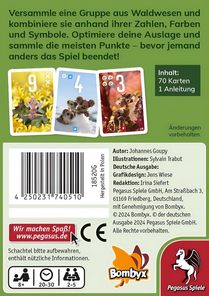 Besonders knifflig: Die Zahl, die ein Pixie zeigt, gibt an, an welche Stelle der Auslage es gelegt werden muss. Daher müssen auch die Auslagen der Mitspielenden stets gut im Auge behalten werden, um zum richtigen Zeitpunkt wertvolle Pixies zu ergattern. Es gewinnt, wer die meisten Punkte über Nummern, Symbole und Farbgruppen sammeln konnte.