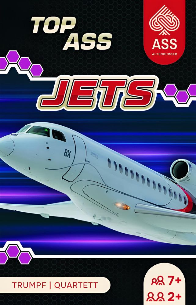 In diesem TOP ASS rund um Giganten der Lüfte und technische Meisterwerke heißt es: Trumpfen, Sammeln, Siegen! Quartett und Trumpf: zwei Klassiker, ein Spiel! Drei Jokerkarten für mehr Spannung enthalten! Technische Kategorien: Höchstgeschwindigkeit, Gewicht, Schubkraft, Länge, Spannweite, Reichweite.