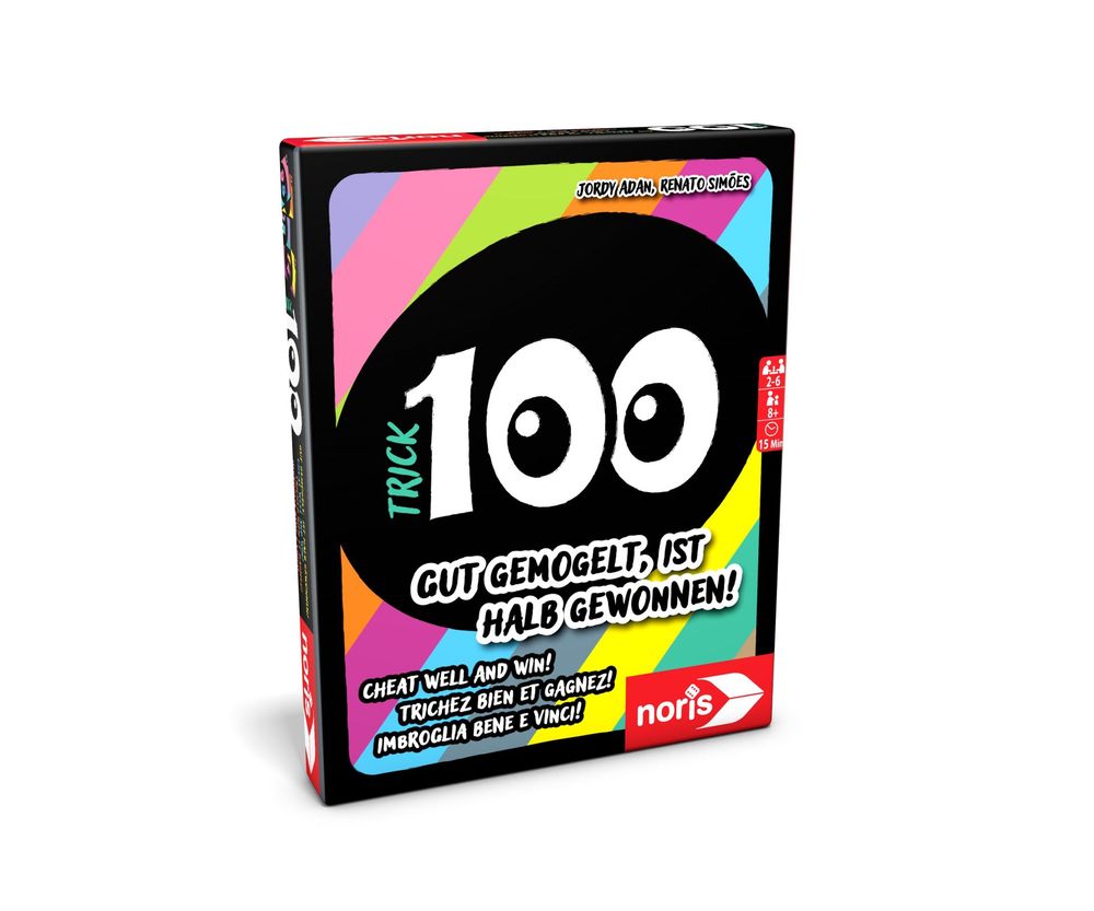 Trick 100 von Noris ist das perfekte Spiel für alle, die bluffen, überbieten und ihre Gegner austricksen wollen. Das Spiel beinhaltet 110 Karten, darunter die "100" als mächtigen Joker. Mit 2-6 Spielern ab 8 Jahren trittst du an, um als Erster alle Karten loszuwerden – aber das gelingt nur, wenn du geschickt überbietest oder deine Gegner mit einem gelungenen Bluff aufs Glatteis führst! Legst du eine Karte verdeckt ab, müssen die anderen entscheiden, ob sie dir glauben oder deine Karte aufdecken. Wer sich irrt, zieht drei Karten!