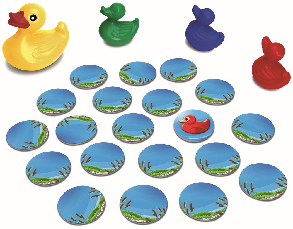 Dann finde das passende farbige Plättchen der letzten Ente und rücke sie an die Spitze. War es das Richtige, darfst du die Ente nach vorne stellen und das Plättchen behalten. Wer am Ende die meisten Plättchen gesammelt hat, gewinnt.