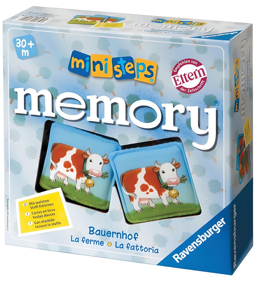 Schon ab ca. 2 1/2 Jahren können Kinder mit memory® ihr Gedächtnis trainieren. Die weichen Stoffkarten bieten hierfür einen idealen Einstieg. Die liebevoll illustrierten Motive zeigen Menschen, Tiere und Fahrzeuge auf dem Bauernhof und machen die Suche nach gleichen Bildpaaren besonders spannend.