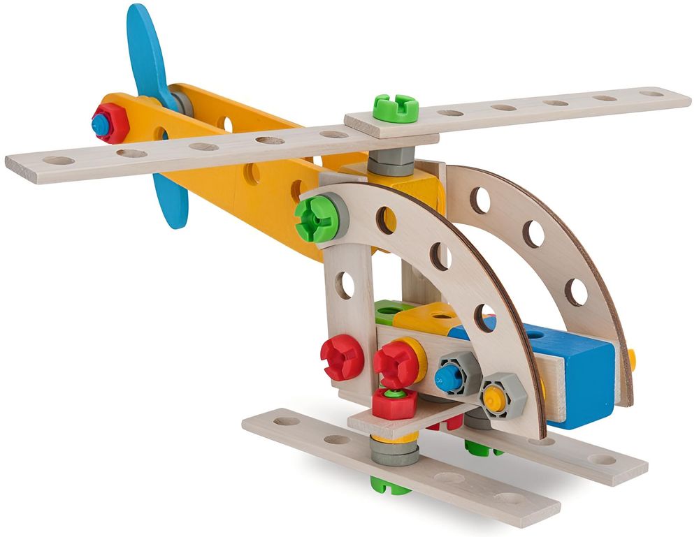 HEROS Constructor, Kranwagen: Aus dem HEROS Constructor Set "Kranwagen" werden mit Schraubenschlüssel und Schraubendreher nach Anleitung eines der vier tollen Modelle gebaut: Kranwagen, Flugzeug, Hubschrauber oder Trike. Natürlich sind der Fantasie keine Grenzen gesetzt und es können auch andere Figuren oder Bauwerke zusammengeschraubt werden. Die Klötze, Leisten, Räder, Schrauben oder Muttern sind individuell miteinander verbaubar und fördern das räumliche Denken und die Feinmotorik. Für die Herstellung der HEROS Contructor Modelle wird ausschließlich FSC &reg 100% Holz aus vorbildlicher Forstwirtschaft verwendet. Für Kinder ab 3 Jahren geeignet.
