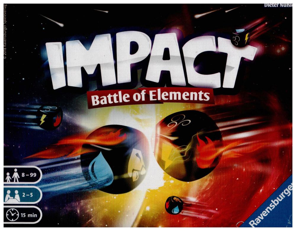 Bei IMPACT kracht es richtig! Reihum feuern die Spieler ihre Elementwürfel in die Arena. Ihr Ziel ist es, möglichst viele Würfel umzustoßen, um die Elemente zu ändern. Nur wenn viele gleiche Elemente in der Arena liegen, erhalten sie Würfel zurück. Wer zuletzt Würfel übrig hat, gewinnt. Einfache Regeln und tolle Würfel machen Impact zu einem Spiel, das in jeder Runde einschlägt!