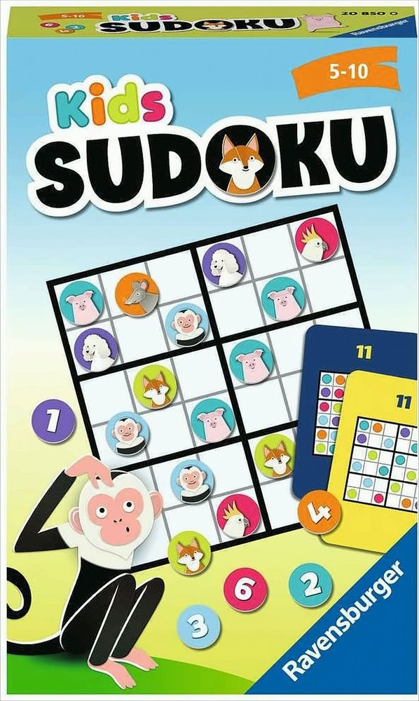 Das spannende und zugleich entspannende Logiktraining für einen Spieler ab 5 Jahren. Zu Beginn werden 4x4 Sudokus gelöst, nach und nach die immer kniffligeren 6x6 Sudokus. Die Vorderseite der Rätselkarte gibt die Startpositionen vor und auf der Rückseite darf später die Lösung kontrolliert werden. Mit bunten Chips, die witzige Tiere oder Zahlen zeigen, werden die Felder auf dem Spielplan belegt. Dabei darf sich keine Farbe in einer Zeile, Spalte oder Viereck wiederholen. Hier ist Köpfchen gefragt und die Lernkurve steigt steil nach oben! Ein Denksport, der herausfordert und gleichzeitig entspannt!