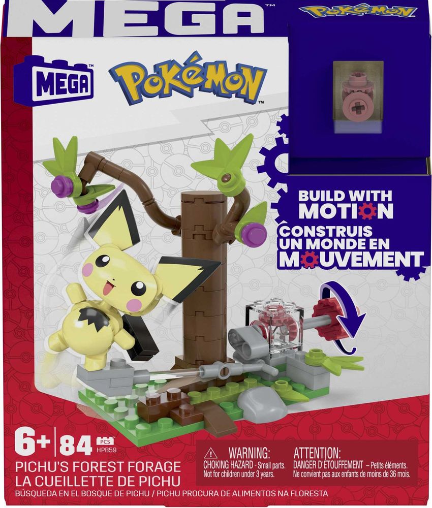 Mit diesem Bauset mit dem innovativem Bewegungsstein können Kinder Beeren sammeln und Spaß im Wald erleben! Kinder können die Waldlandschaft zusammenbauen und im Anschluss an der Kurbel drehen, um Pichu dabei zu beobachten, wie es Beeren von einem Strauch pflückt. In Kombination mit anderen Abenteuerbausets kann eine noch größere Pokémon-Welt mit sich bewegenden Elementen gebaut werden. Artikel separat erhältlich.