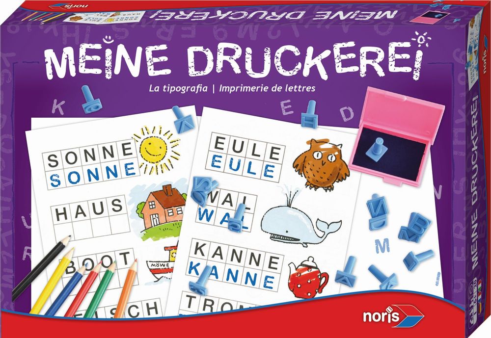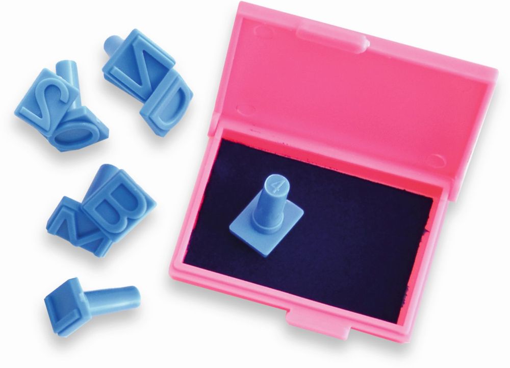 Inhalt: 46 Buchstaben, Ziffern und Zeichen, Vorlagenheft mit Abbildungen und Aufgaben, Stempelkissen, Spielanleitung.