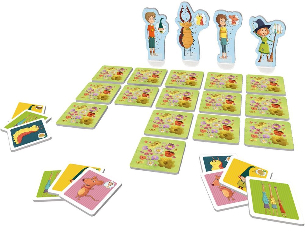 So ein Durcheinander! Die kleine Hexe Petronella Apfelmus und die Zwillinge Lea und Luis erleben in diesem Spiel ein neues Abenteuer. Diesmal verwandelt Petronella mit schrägen Zaubersprüchen Raupe Amanda, die Apfelmännchen, Wichtel Nisse und Maus Hilda aus Versehen in ein buntes Beet. Die Spieler müssen ihr aus dieser misslichen Lage helfen! Schnell die Regeln durchlesen und schon kann die Rettungsaktion beginnen: Die Zaubergarten-Karten liegen verdeckt in der Tischmitte und ähneln einem Gemüsebeet. Wer kann sich bei diesem Gesellschaftsspiel am besten merken, wo die verzauberten Gartenfreunde versteckt sind? Petronella muss den richtigen Weg finden, um sie wieder zurück zu verwandeln. Nicht nur für Fans der Petronella Apfelmus Reihe ist das Kinderspiel ein wunderbares Mitbringsel und Geburtstagsgeschenk.