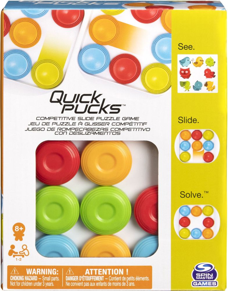 Quick Pucks - wer schiebt am schnellsten? Beide Spieler versuchen gleichzeitig, die auf den Aufgabenkarten vorgegebenen Farbkombinationen zu er-schieben. Wer fertig ist, haut auf die Glocke und bekommt die Karte. Es gewinnt, wer zuerst 5 Karten gesammelt hat. Zwei Kartensätze mit unterschiedlichen Schwierigkeitsgraden ermöglichen einfache und anspruchsvolle Spielrunden. Auch eine spannende Solitärregel ist enthalten. Quick Pucks – Familienspiel für 1-2 Spieler ab 8 Jahren. Mit weiteren Spielsets auch mit mehr als 2 Spielern spielbar.