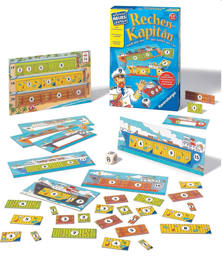 Wohin mit der Bananenkiste? Ist noch Platz in diesem Boot? Am Hafen laden die Matrosen wertvolle Fracht in ihre Schiffe. Bei Rechen-Kapitän ist jedes Schiff unterschiedlich groß und muss optimal mit einer Warensorte beladen werden. Die jüngeren Kinder lernen die Schiffe zunächst im Einzelspiel oder gemeinsam kennen, indem sie die Waren einladen. Sie lernen, dass das Addieren der Warenkisten der Schiffsgröße entspricht. Ob sie richtig liegen, überprüfen sie eigenständig durch das Einlegen der Ware in die Schiffe. Welche Schiffe sind zuerst voll mit Bananen, Spielen oder Holz und können das Abenteuer auf hoher See antreten? Für ältere Spieler gibt es übrigens weitere Schwierigkeitsgrade wie einen Würfel mit Aktionssymbolen oder unterschiedliche Warensorten und Lagerhallen. Bei Rechen-Kapitän ist stets logisches Denken und strategisches Vorgehen gefragt, denn der Kapitän möchte nicht zu oft hin und her fahren. Werfen Sie auch einen Blick auf die weiteren Spiele der Reihe Spielend Neues Lernen für Kindergarten- und Grundschulkinder, denn alle decken spielerisch relevante Themen ab und ermöglichen eigenständiges Lernen. Ahoi!