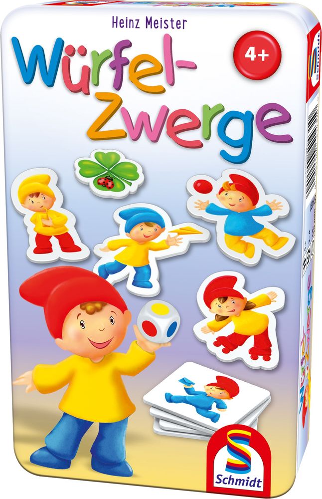 Würfelzwerge"Die 10 kleinen bunten Zwerge möchten mit euch spielen. Würfelt die drei Farbwürfel und schaut genau: Welcher Zwerg entspricht der Würfelkombination und wo hat er sich unter den verdeckten Karten versteckt? Passt gut auf und seid schnell, dann gewinnt ihr die lustige Zwergensuche."