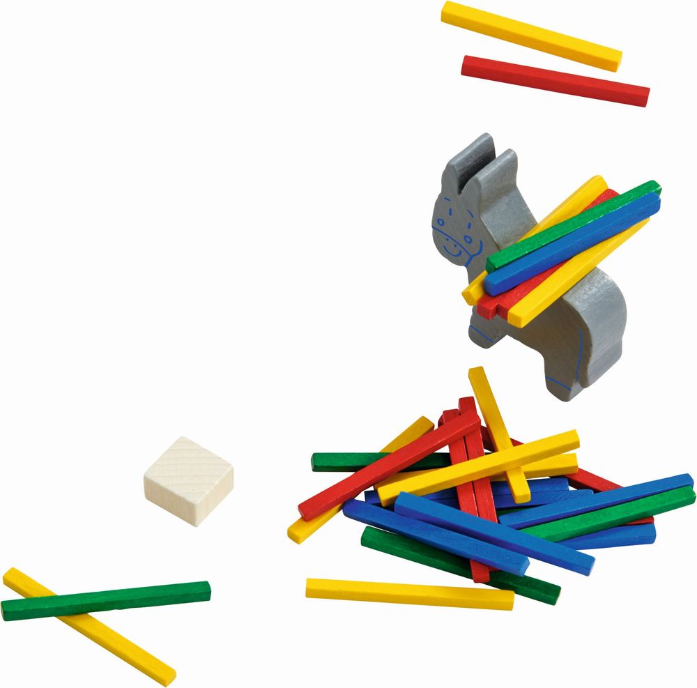 I-ah, der Packesel ist da! Geduldig steht er zum Abmarsch bereit, aber bevor es losgehen kann, müssen die Gepäckstücke aufgeladen werden! Ziel des Spiels ist es, als Erster alle eigenen Stäbchen auf den Rücken des Esels zu legen, ohne dass etwas herunterfällt.