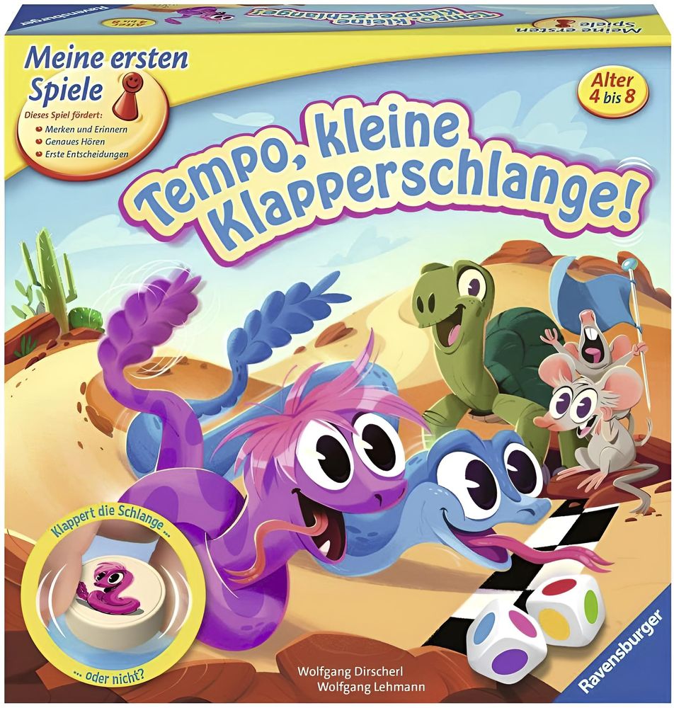 Nach "Tempo, kleine Schnecke!", dem Kinderspiele-Klassiker, der bereits für viele Eltern auch ihr erster Einstieg in die Welt der Brettspiele war, bringen nun die Klapperschlangen eine neue, spannende Herausforderung für Kinder ab 4 Jahren