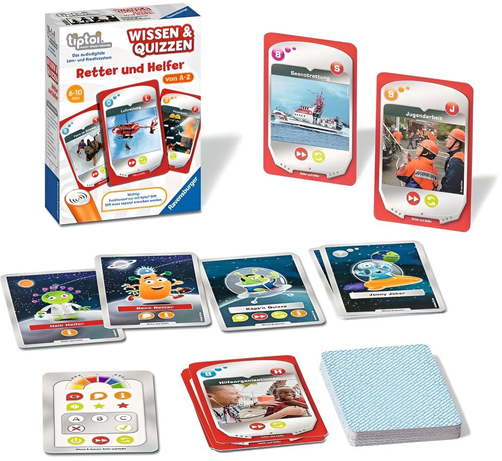 Im diesem spannenden Wissens-Quiz-Spiel erfährt man bei Entdecken alles, was es über Retter und Helfer von A bis Z zu wissen gibt. Im Quiz kann das Wissen unter Beweis gestellt werden. Ob allein oder gemeinsam, tiptoi stellt verschiedene Fragen zu den Rettern und Helfern. Dabei muss bei manchen Fragen herausgefunden werden, ob die Aussage stimmt oder welche der drei Antworten die richtige ist. Manchmal müssen auch die passenden Retter und Helfer zur Frage gefunden werden. Das Spiel Retter und Helfer kann mit allen anderen Wissen & Quizzen Spielen von tiptoi kombiniert werden. Neben dem Lexikonwissen und Quizspiel ist ein Kartenspiel für zwei bis sechs Spieler im Spiel dabei.