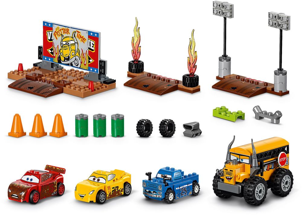 - Enthält die Charaktere Lightning McQueen und Cruz Ramirez mit Schlammspritzern sowie Broadside und Miss Fritter aus Disney Pixar Cars 3.
