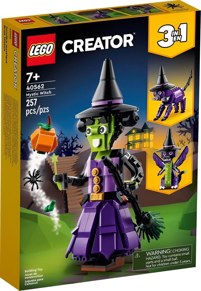 LEGO 40562 Creator 3 in 1 Mystic Witch bringt stimmungsvolle Halloween-Atmosphäre ins Kinderzimmer. Das Set bietet drei verschiedene Bauoptionen: eine geheimnisvolle Hexe mit Besen, eine unheimliche Katze und einen kleinen Drachen. So entstehen immer neue Geschichten und Spielideen, ohne dass zusätzliche Steine nötig sind.