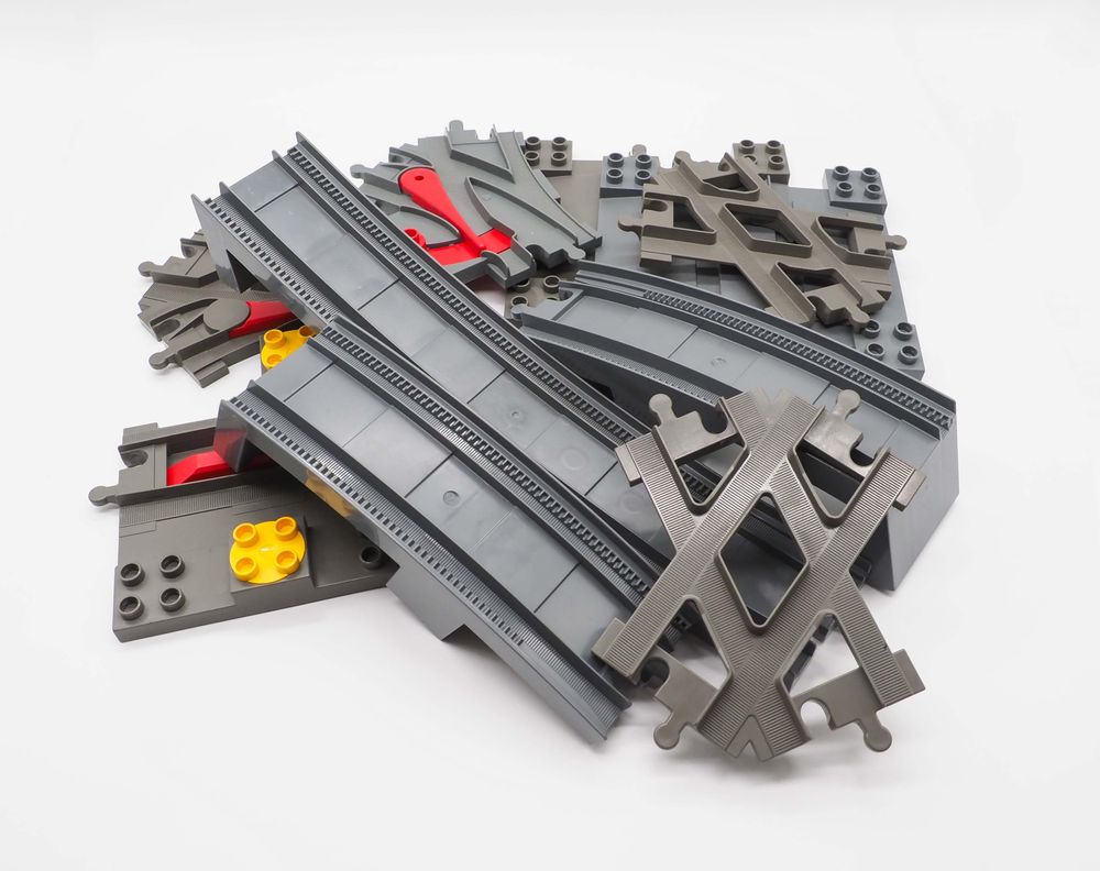 Dieses Set enthält 10 graue Sonderschienen der Marke Lego Duplo (Brücken, Weichen, Kreuzungen usw. möglich). Eine Auswahl der zufällig sortierten Teile ist nicht möglich.