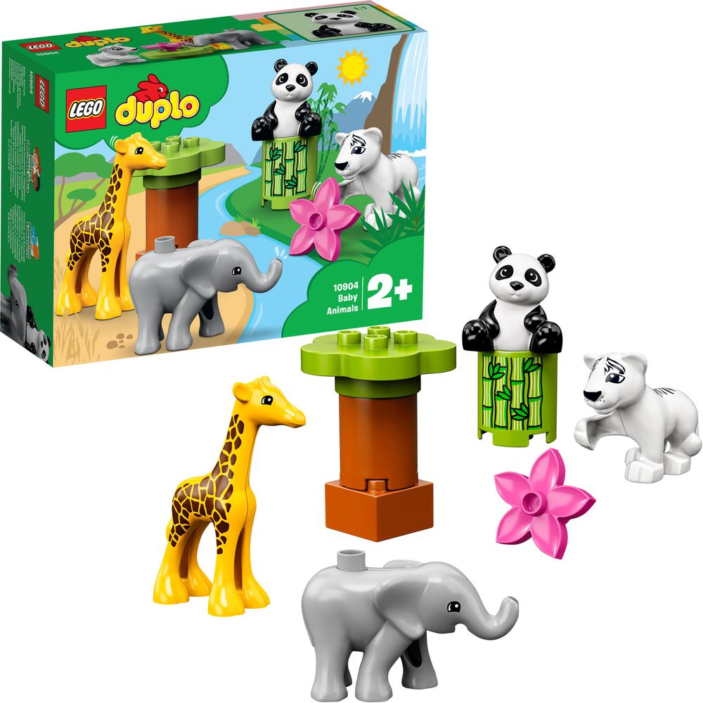 - LEGO DUPLO Tierset mit 4 niedlichen Tierbabys: ein Panda, ein weißer Tiger, eine Giraffe und ein Elefant.
