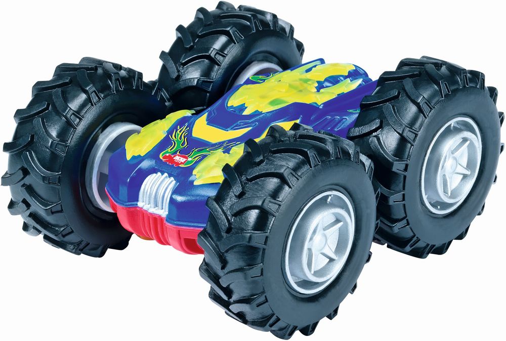 Die 10 cm große Überschlagfahrzeuge mit Friktion sind in vier verschiedenen Farben erhältlich. Altersempfehlung 3+ Jahre