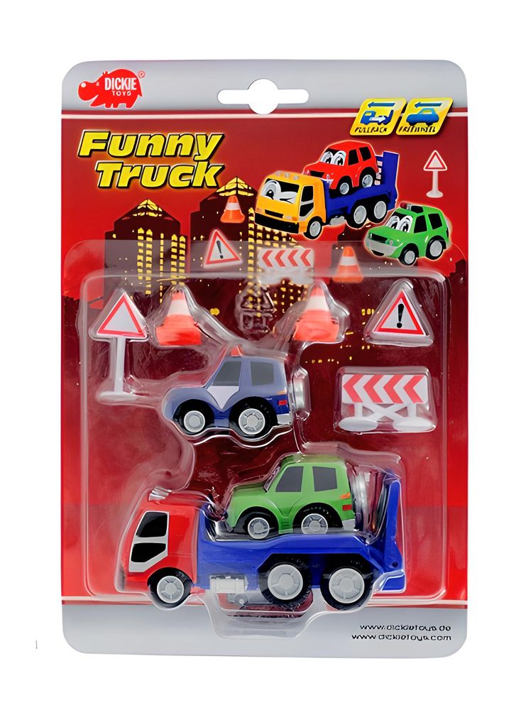 Ca. 11cm großer Abschlepper im Comicstyle mit Rückzugmotor, 2 Freilauf Autos und 5 Verkehrszeichen.