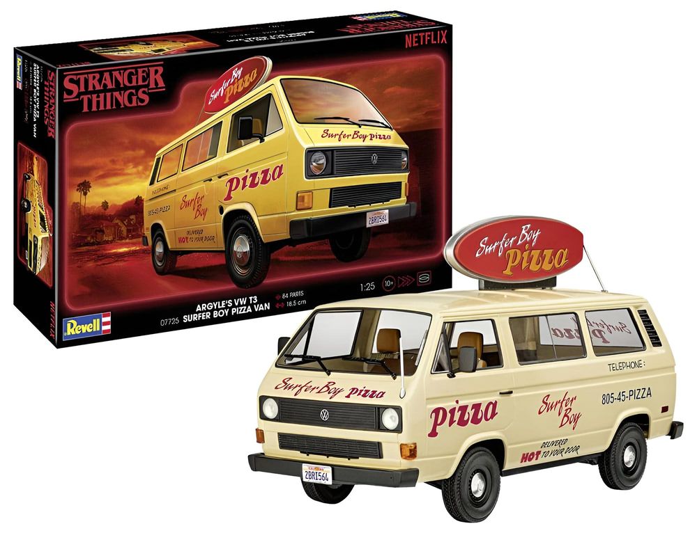 Der VW T3 mit dem Slogan Surfer Boy ist aus der vierten Stranger Things Staffel bekannt und ist als Bausatz für Einsteiger erhältlich. Maßstab 1:25. 96 Teile. 185 mm Länge. Geeignet ab 10 Jahren.