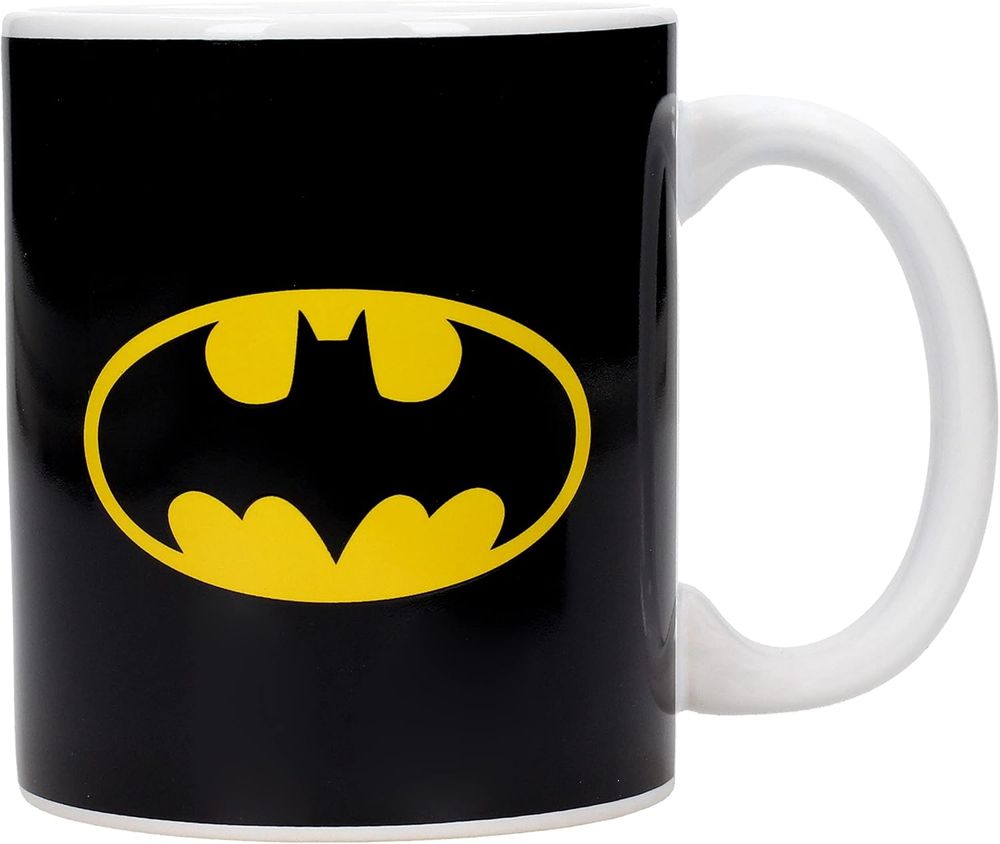 Die DC Comics Tasse mit Batman Logo bringt den Stil von Gotham City direkt auf den Schreibtisch oder Frühstückstisch. Das markante Fledermaus-Symbol steht klar im Mittelpunkt und macht die Tasse zu einem sofort erkennbaren Fanartikel für alle Liebhaber der dunklen Ritterfigur.