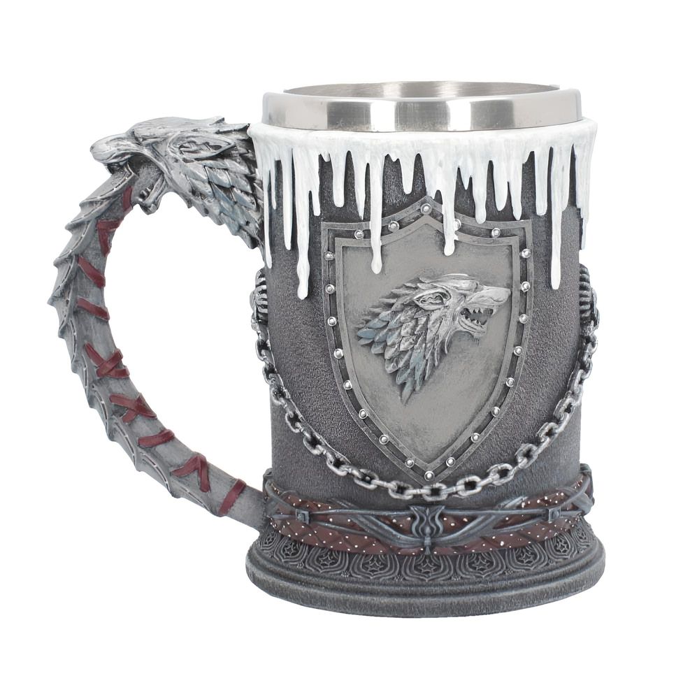 Der Game of Thrones Krug Stark ist ein detailreich gestalteter Trinkkrug für Fans des Hauses Stark aus dem Norden von Westeros. Im Mittelpunkt steht das markante Wappen mit dem Schattenwolf, das aufwendig ausgearbeitet ist und dem Krug eine eindrucksvolle, dekorative Wirkung verleiht. Die Form liegt angenehm in der Hand und macht ihn sowohl beim gemütlichen Fernsehabend als auch bei geselligen Runden zum Blickfang.