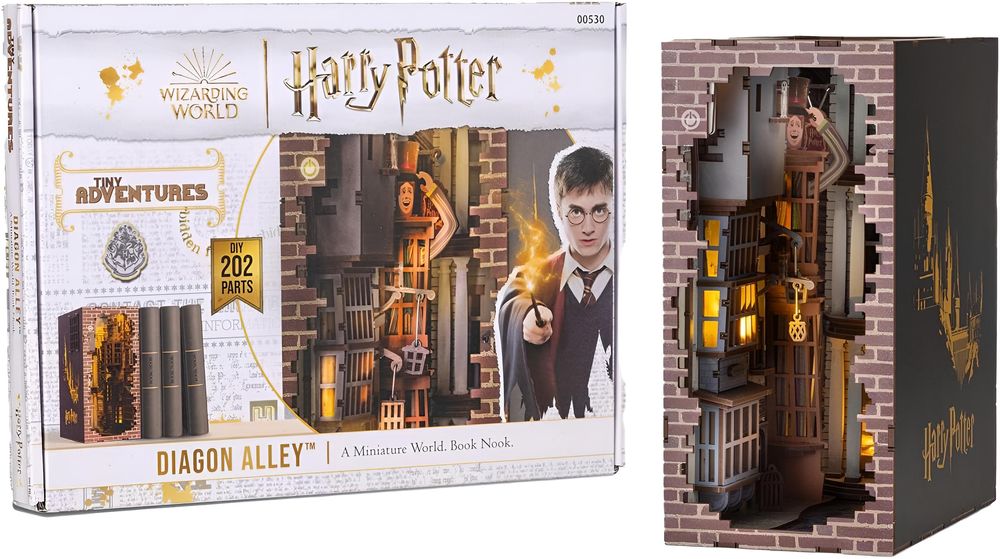 Das Harry Potter Tiny Adventures Book Nook Mini-Diorama Winkelgasse, 23 cm verwandelt jedes Bücherregal in einen magischen Durchgang zur Welt der Zauberer. Zwischen zwei Büchern platziert, öffnet sich eine detailreiche Gasse mit liebevoll gestalteten Fassaden, Schaufenstern und kleinen Überraschungen für aufmerksame Betrachter. Die kompakte Bauweise macht das Diorama ideal für Regale, Schreibtische oder Vitrinen.