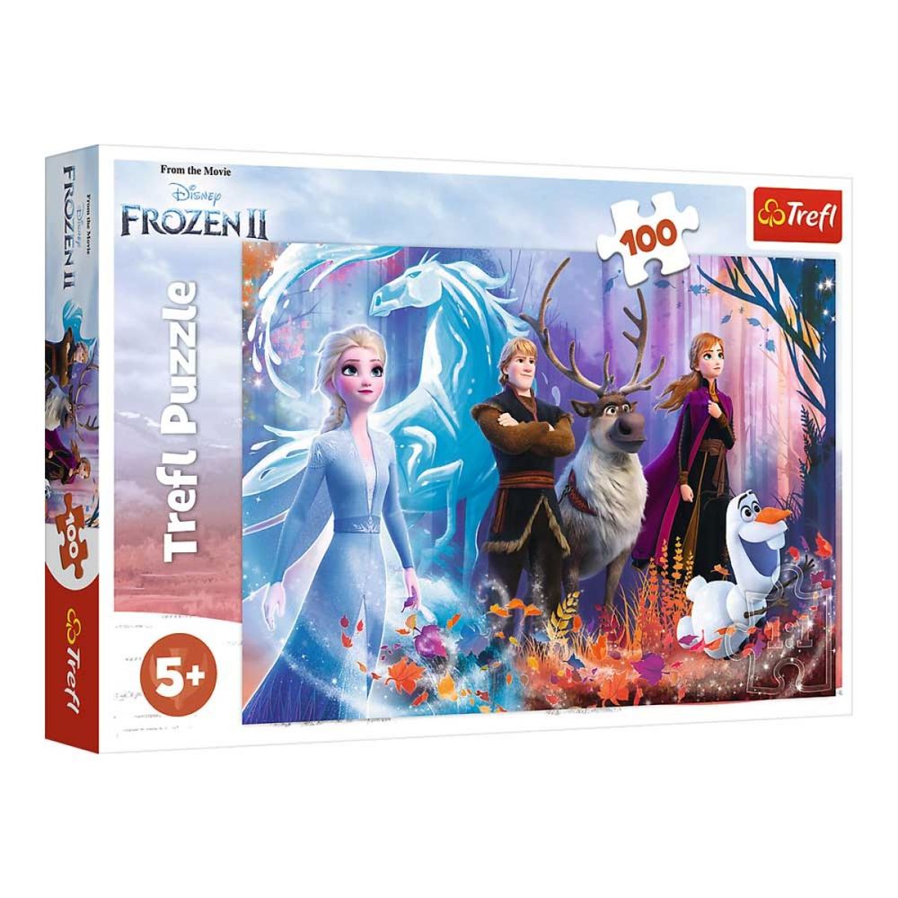 Anna und Elsa ziehen mit ihren Freunden Sven, Olaf und Kristoff auf in neue Abenteuer. Frozen II Puzzle mit 100 Teilen. Für Kinder ab 5 Jahren.
