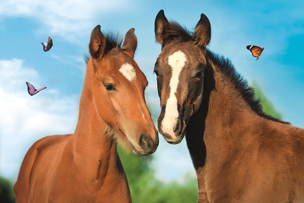 • Motiv: liebevoll illustriertes Pferdepaar in freundlicher Umgebung