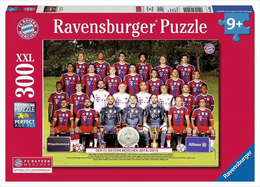 Puzzle - FC Bayern Saison 2014/15, 300 XXL-TeileErleben Sie ein unvergleichliches Puzzlevergnügen mit Ravensburger Qualitätsprodukten. Die einzigartigen Puzzleteile passen perfekt ineinander. Dank handgefertigter Stanzwerkzeuge ist die Formenvielfalt der Ravensburger Puzzleteile unübertroffen.Das ist die Ravensburger Leidenschaft für Qualität.