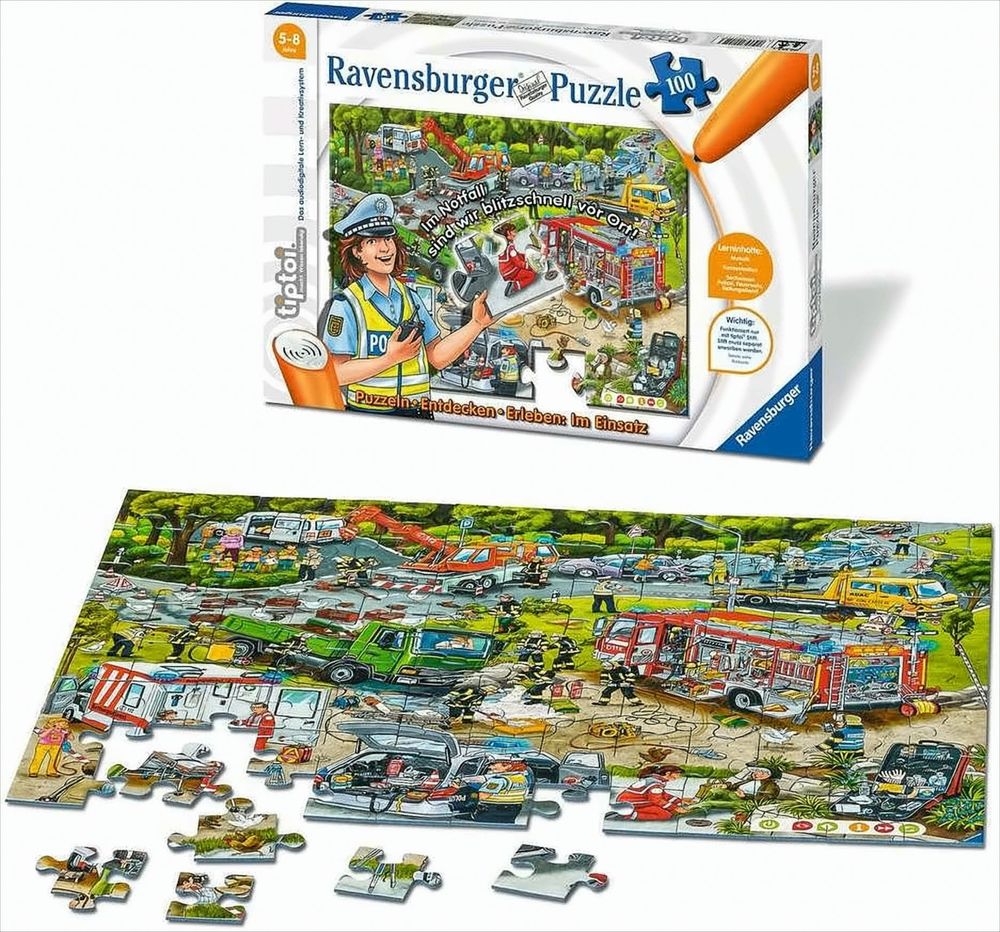 Aufgepasst, dort auf der Straße ist ein Unfall passiert. Gut, dass die Polizei schon vor Ort im Einsatz ist. Noch ist das Puzzle nicht fertig und man kann nur wenig erkennen. Also sorgsam fertig puzzeln, dann kann es losgehen. Beim Entdecken mit dem tiptoi Stift erfahren die Kinder alles über die Welt der Einsatzkräfte. Geräusche machen die Themenwelt lebendig und das Wissen prägt sich noch besser ein.